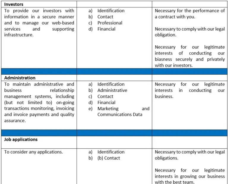 If you are contacting us on behalf of a company, or if you intend to engage with us in any other business transaction, we may need to transfer your Personal Data to a third party for processing where this is required in connection with the purpose for which it was collected. We may be legally, contractually or otherwise obligated to share your Personal Data with (a) professional advisers, including transfer agents, consultants, lawyers, accountants, bankers and auditors, (b) regulators and government bodies, (c) IT service providers, (d) any other third-party service where the transfer of information is required in connection with the purpose for which it was collected.